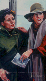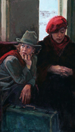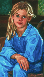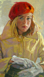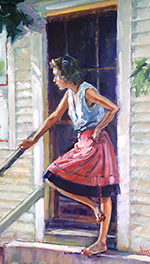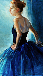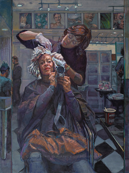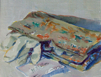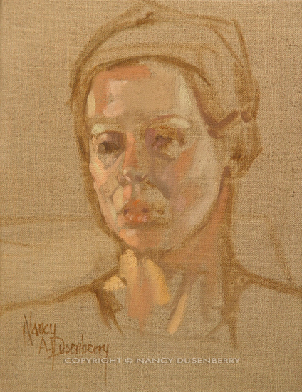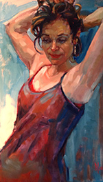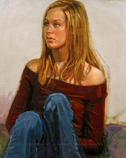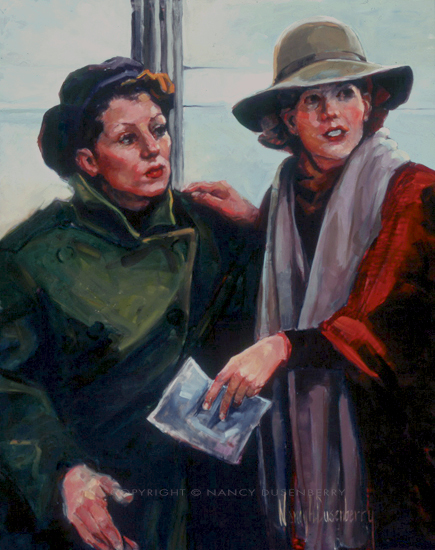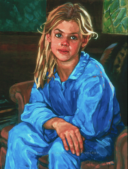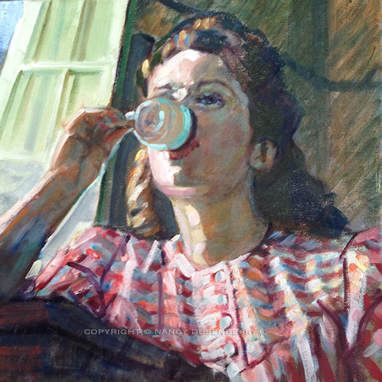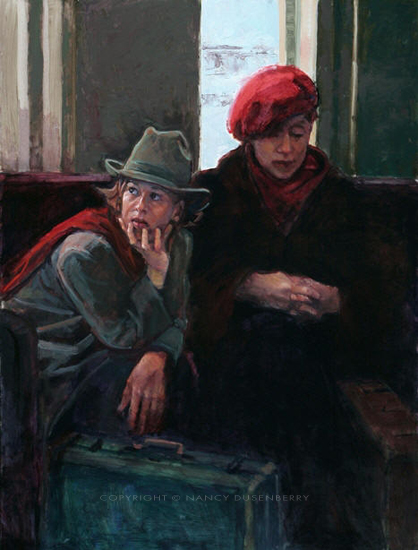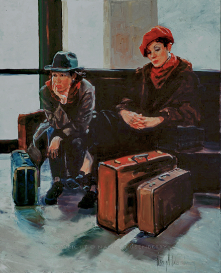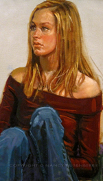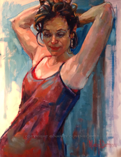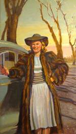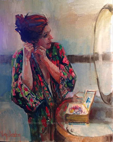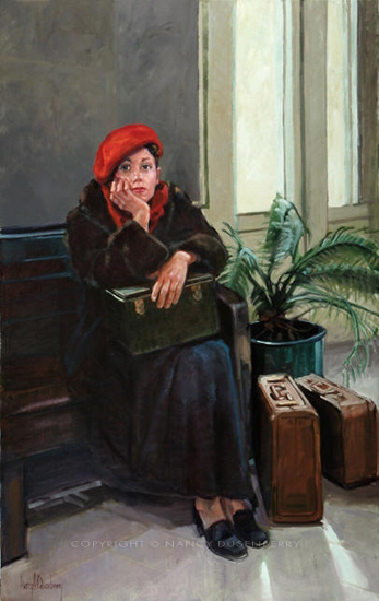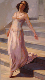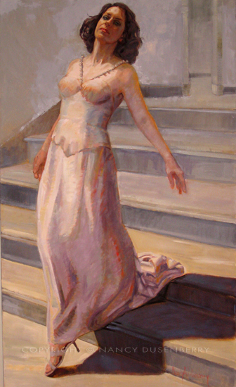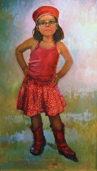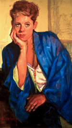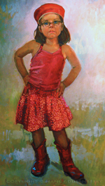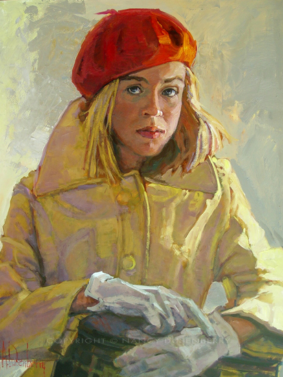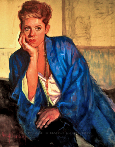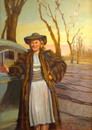 We may not be typical, but the way my family chronicles time and events is by what we wore. We remember it all. Each of us can describe Mother’s coats, shoes, hats and gloves. We enrich every “coat and white pique hat, and I was in that blue faille duster with matching tam.” We test each other’s memories with the likes of, “What coats hung in the back hall on Oak Street?” and laugh until we fall down remembering Daddy in his brown jacquard bathrobe, hair all wild with sleep, shod in size 14 moccasins, scaring suitors off of our front porch. Once I asked my 100 year old, blind and nearly deaf Grandmother what she did with her time. She answered, “I remember.” I know the fabric of the women I have painted. I know which ones were vulnerable, which ones confident, which ones funny, which ones zany or not to be trifled with. I love to paint women wearing the clothes they chose.